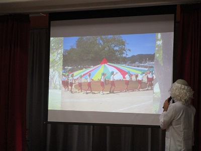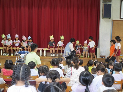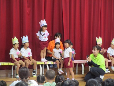 初めに誕生児の紹介。2か月ぶりの誕生日会となりましたが今回も5歳児がインタビューのお手伝い。少し恥ずかしそうでしたが頑張りました!